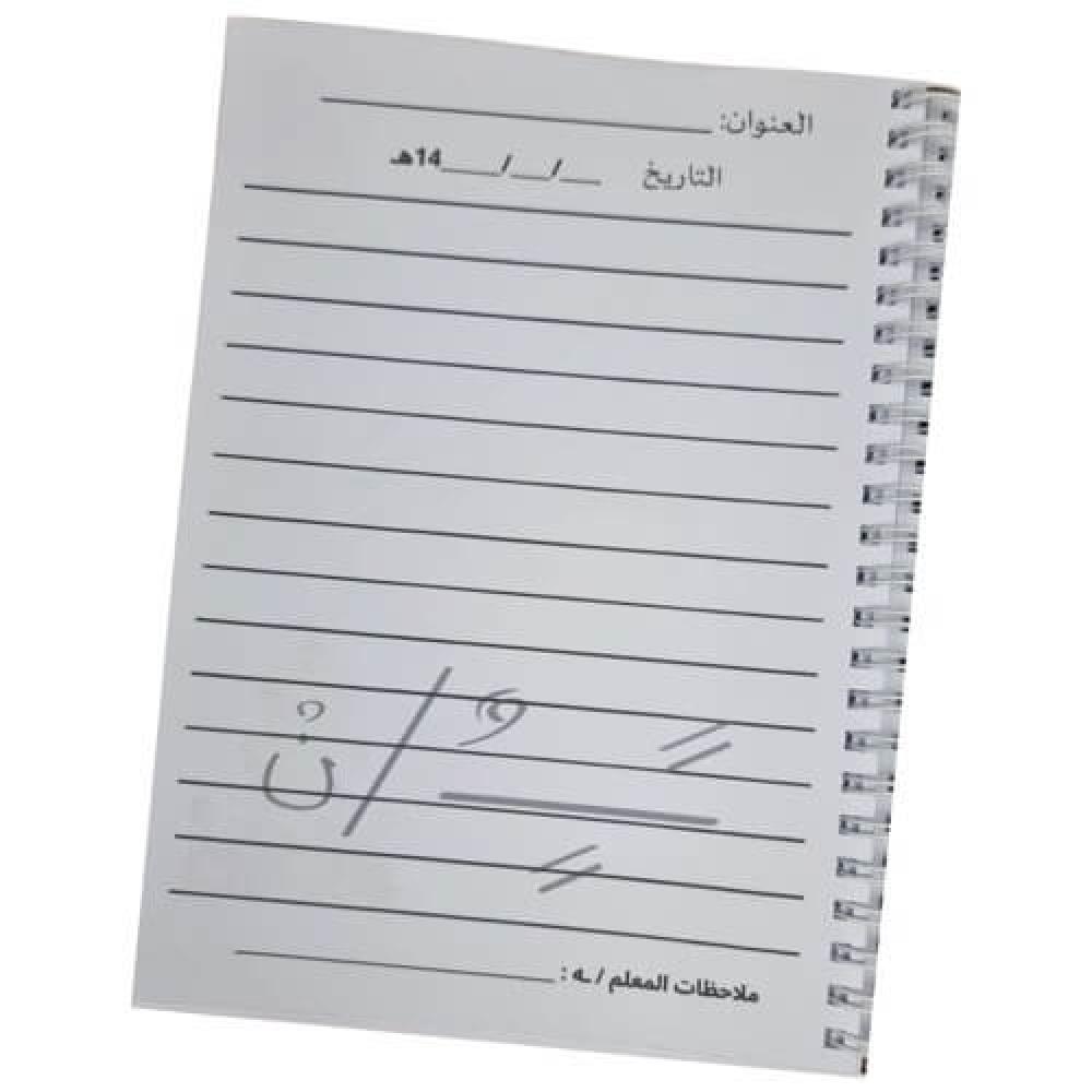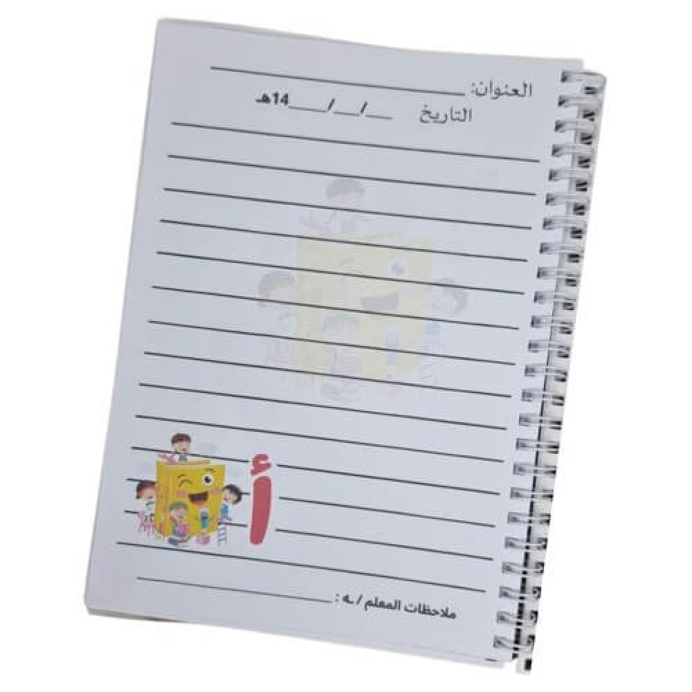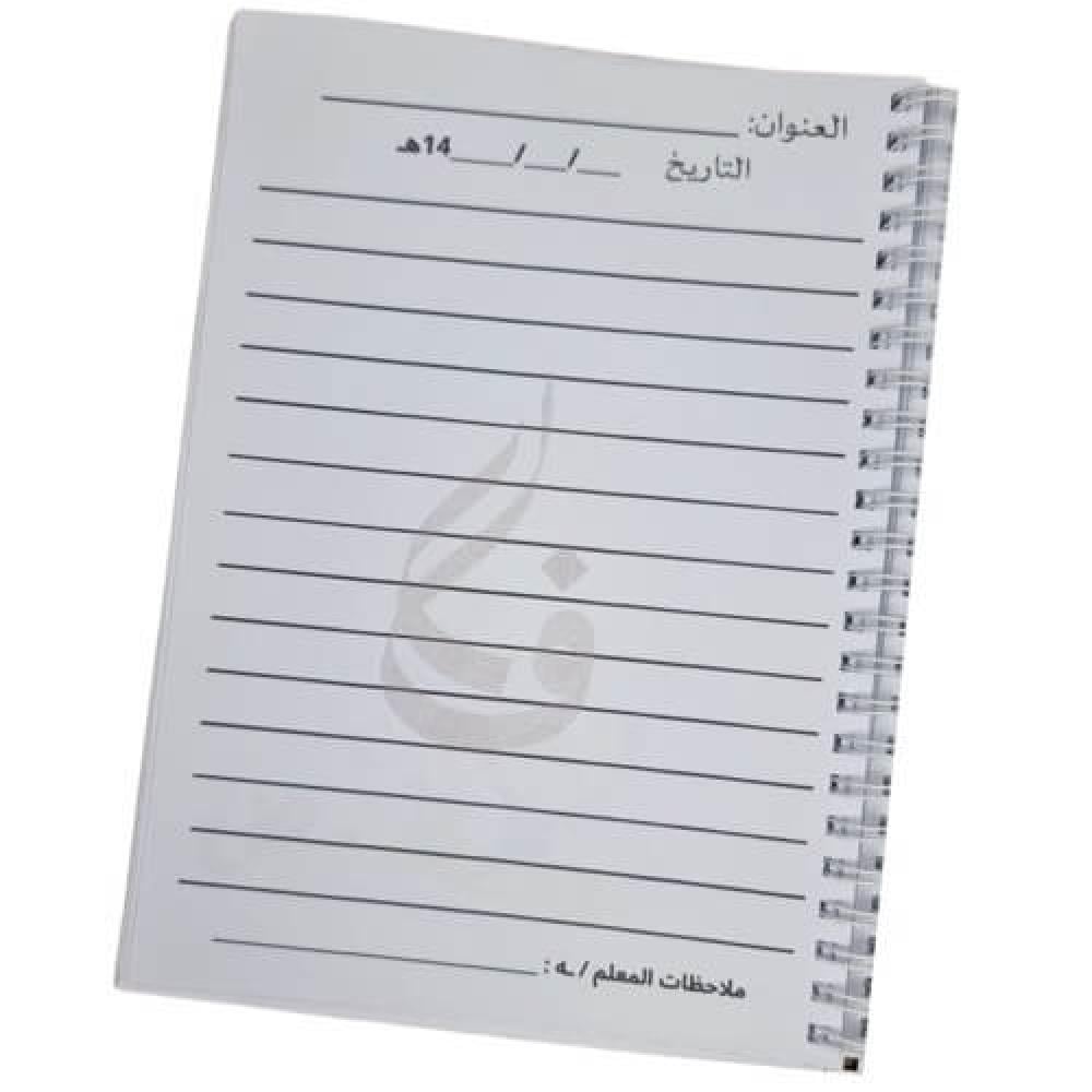 المقاس A5 سهل الحمل ويأتي افتراضيًا بـ40 صفحة مع إمكانية زيادة عدد الصفحات من الخيارات والتعديل المتاح يكون على الاسم والصف والمادة فقط