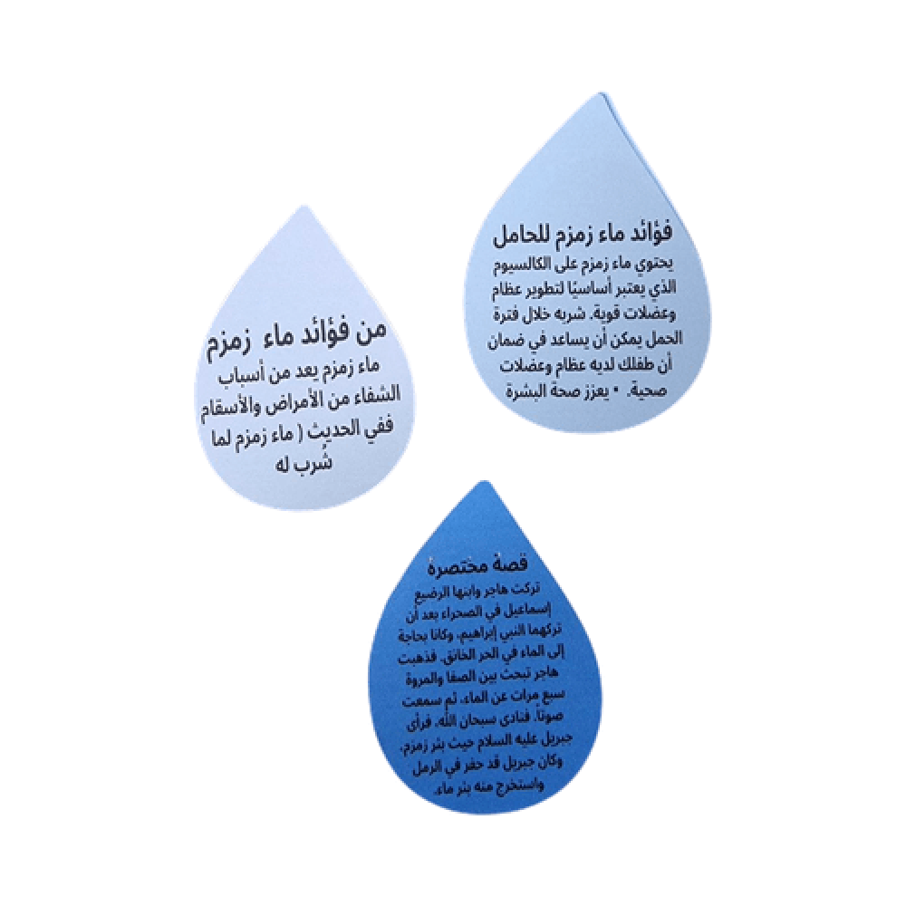 مطوية تعليمية للأطفال تعرّفهم بقصة ماء زمزم وأهميته في الإسلام بأسلوب تفاعلي يساعد على المشاركة الصفية ويشجّع على التعلم