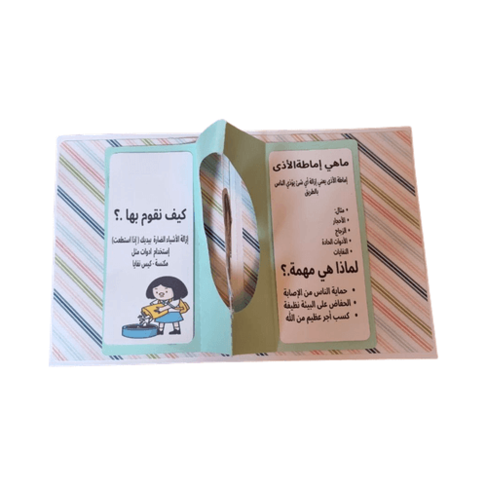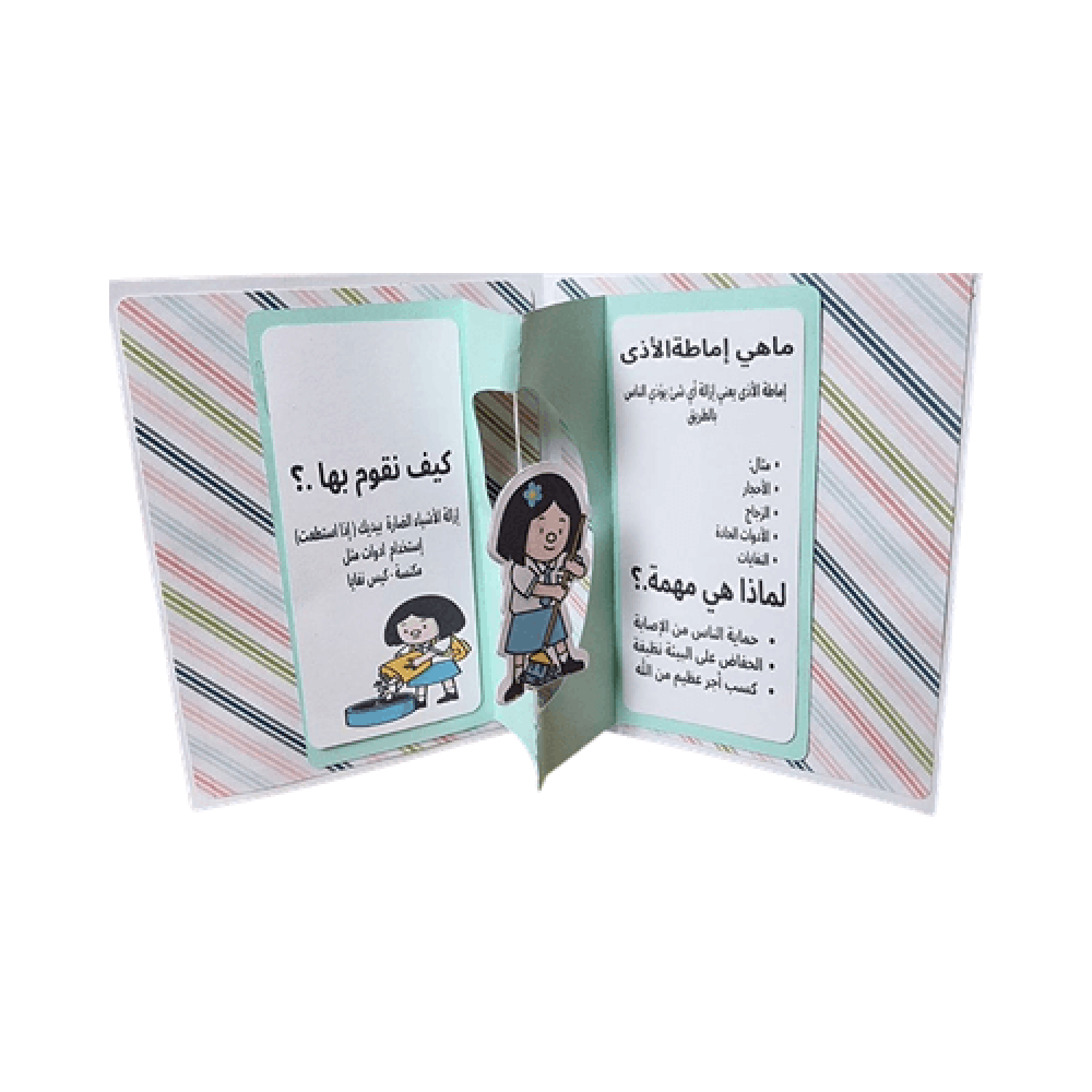مطوية تعليمية للأطفال عن إماطة الأذى عن الطريق تساعد على فهم السلوك الإيجابي والنظافة العامة وتناسب المدارس والأنشطة الصفية