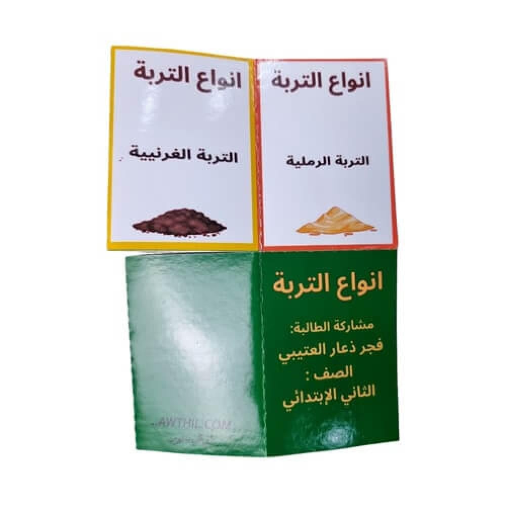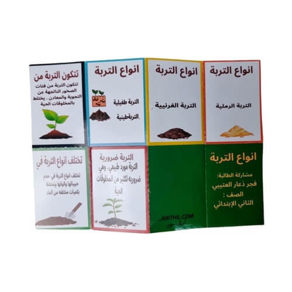 وإذا ودّك تعدّلين على مطوية أنواع التربة المعروضة (العبارات، الألوان، إضافة شعار المدرسة أو صورة الطالب)، راسلينا ونرتّب لك التعديل المناسب.