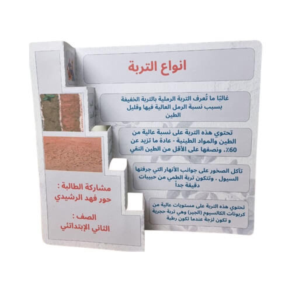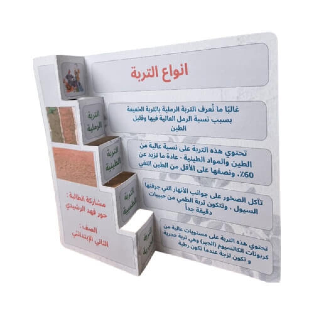 هذا المنتج يعرض مطوية تفاعلية عن أنواع التربة بتقسيم واضح (مثل الرملية والطينية) تساعد الطفل يفهم المفهوم العلمي بسرعة وبطريقة بصرية ممتعة، مناسبة لحصص العلوم والمشاريع الصفية في متجر حرفة